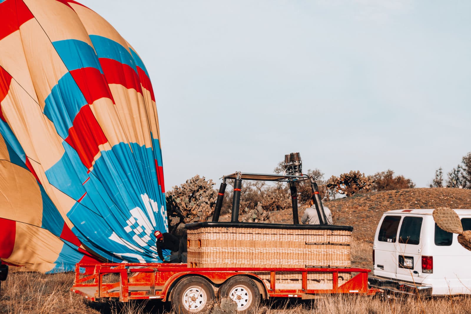 Zu guter Letzt landeten wir doch tatsächlich im nahegelegenen Kaktusfeld! Abenteuer gab es also noch oben drauf. Die abholende Crew war allerdings fit, schnell wurde der Ballon eingewickelt und samt Ballonkorb auf einen Anhänger geladen, während wir schon sicher im Van saßen, der uns zurück zum Flugplatz gefahren hat.