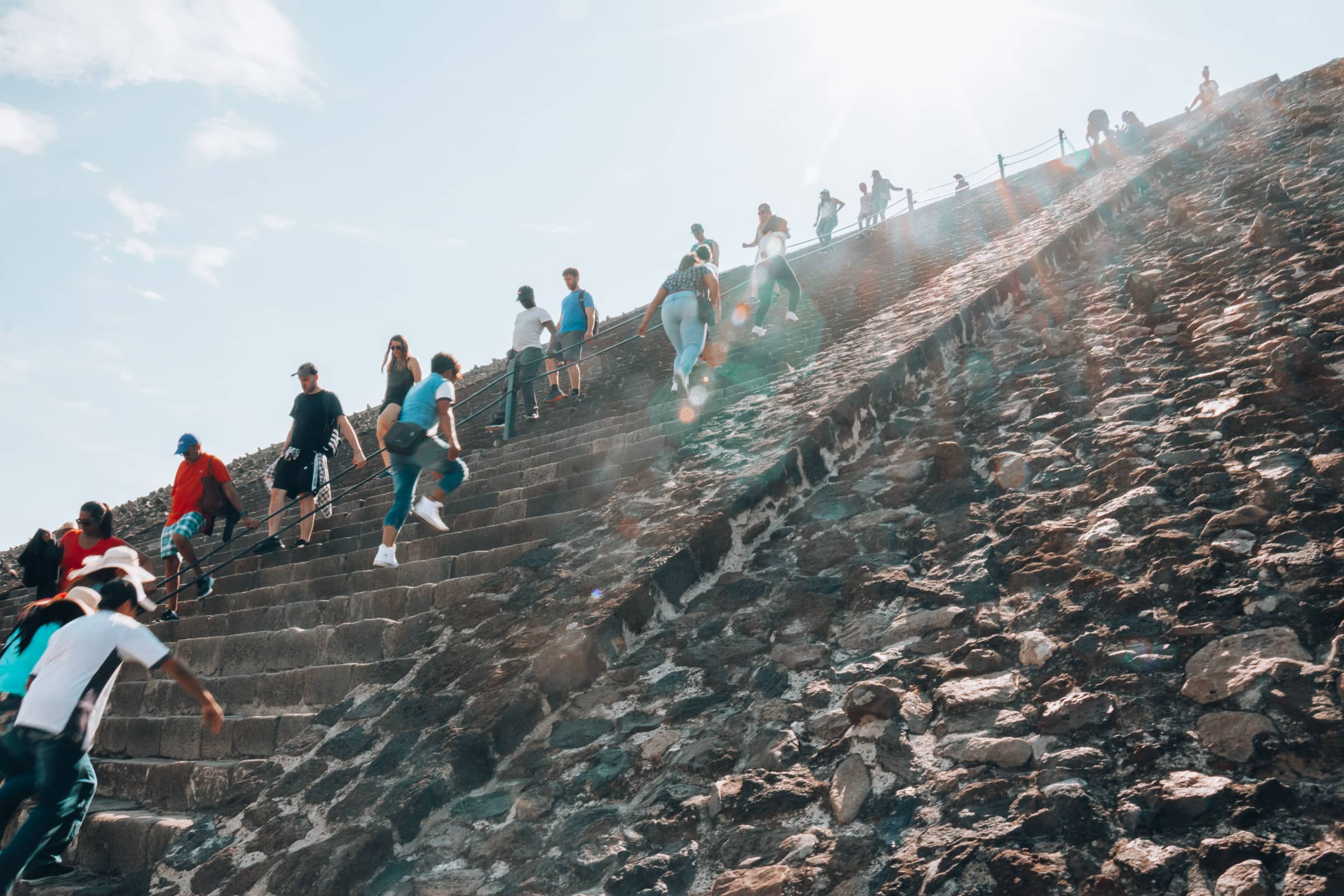 Ganz schön steil: Zur Mittagszeit ist der Aufstieg der Sonnenpyramide eine Tortur!