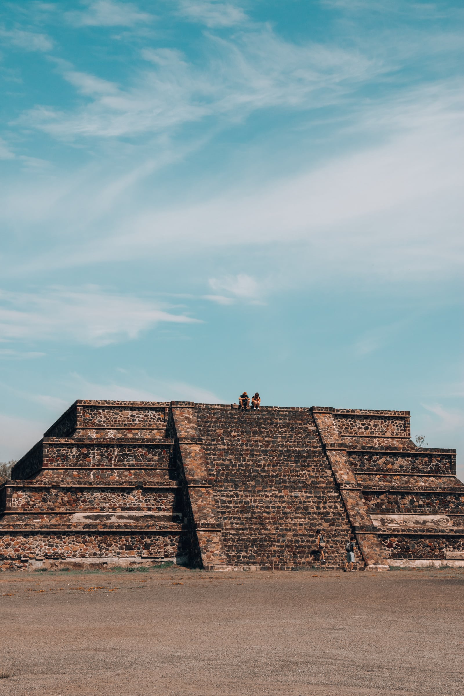 Was oben popelig aussah, war von unten nicht mehr ganz so popelig. Im Anschluss an die Fahrt gab’s noch Zeit für eine Besichtigung der Anlage zu Fuss. Wer sehr interessiert ist, kann sich am Eingang der Pyramiden von Teotihuacán einen Führer buchen, der einem ein bisschen was erklärt. Aber gucken und selbst erkunden geht eigentlich auch. Denn das Raufklettern auf die Sonnenpyramide kann einem der Führer auch nicht abnehmen - das absolute Highlight! Also rauf auf die Sonnenpyramide, mit Treppen so steil und Stufen so hoch, dass man sich eigentlich auch locker auf allen Vieren raufhangeln kann. Wie das das gebrechliche Ehepaar um die 80 geschafft hat, die mir auf dem Weg nach oben entgegenkamen, wird mir für immer ein Rätsel bleiben. (Und hat mich für ungefähr fünf Minuten angespornt, doch mal wieder mehr Sport zu machen.)