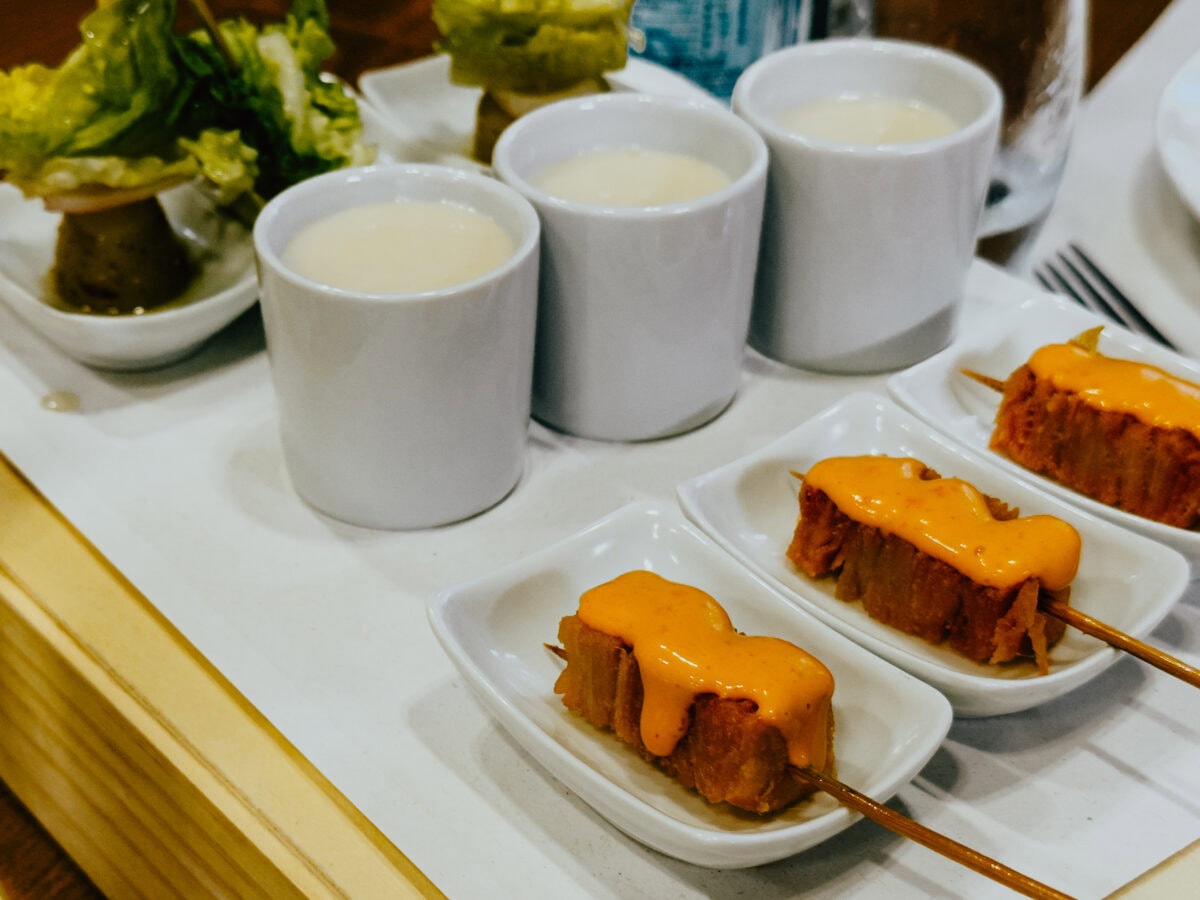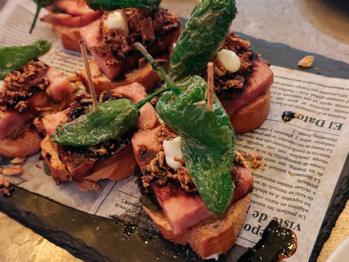 Bevor du dich aber ins Getümmel der vielen Bars stürzt, solltest du dich mit der Tradition der Pintxos in Bilbao vertraut machen. Pintxos (auf Spanisch: Pinchos) heißt wörtlich übersetzt Spieße und sind etwas größere Häppchen, die gerne zu einem Getränk gesnackt werden.