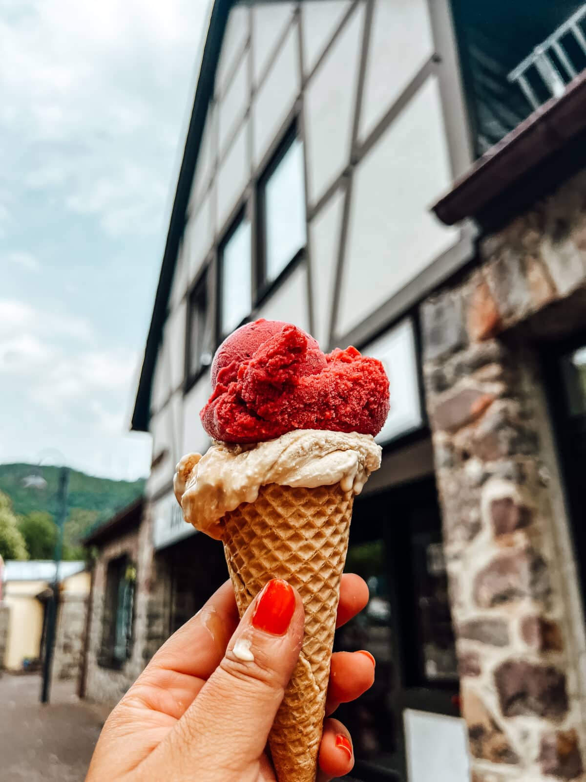 Tipp: Nach der Staumauer und dem Besucherzentrum ist dir bestimmt nach einer kleinen Erfrischung – und die beste Gelegenheit dafür ist ein Eis von Lecko Mio, quasi nebenan. Leider gibt’s hier keine Sitzmöglichkeiten und der Laden an sich ist miniklein, aber was Besitzer Steffen hier jeden Tag während der Saison von April bis Oktober an Eiskreationen raushaut, braucht sich vor trendy Großstadt-Eisläden nicht zu verstecken.