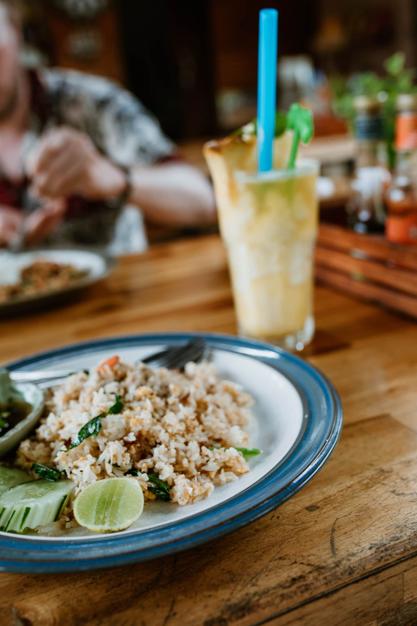 For the physical well-being one has to fall back on the resort’s own restaurant relatively often due to the lack of alternatives. They offer the usual Western food tourist menus there (not great), but the Thai options are really, really good, and definitely worth the higher price. Here I sipped the best Khao Tom (rice soup) ever and with luck Mr. Chung also organizes specialties out of the line, like Hor Mok with Barracuda, a fish curry pie cooked in banana leaves.