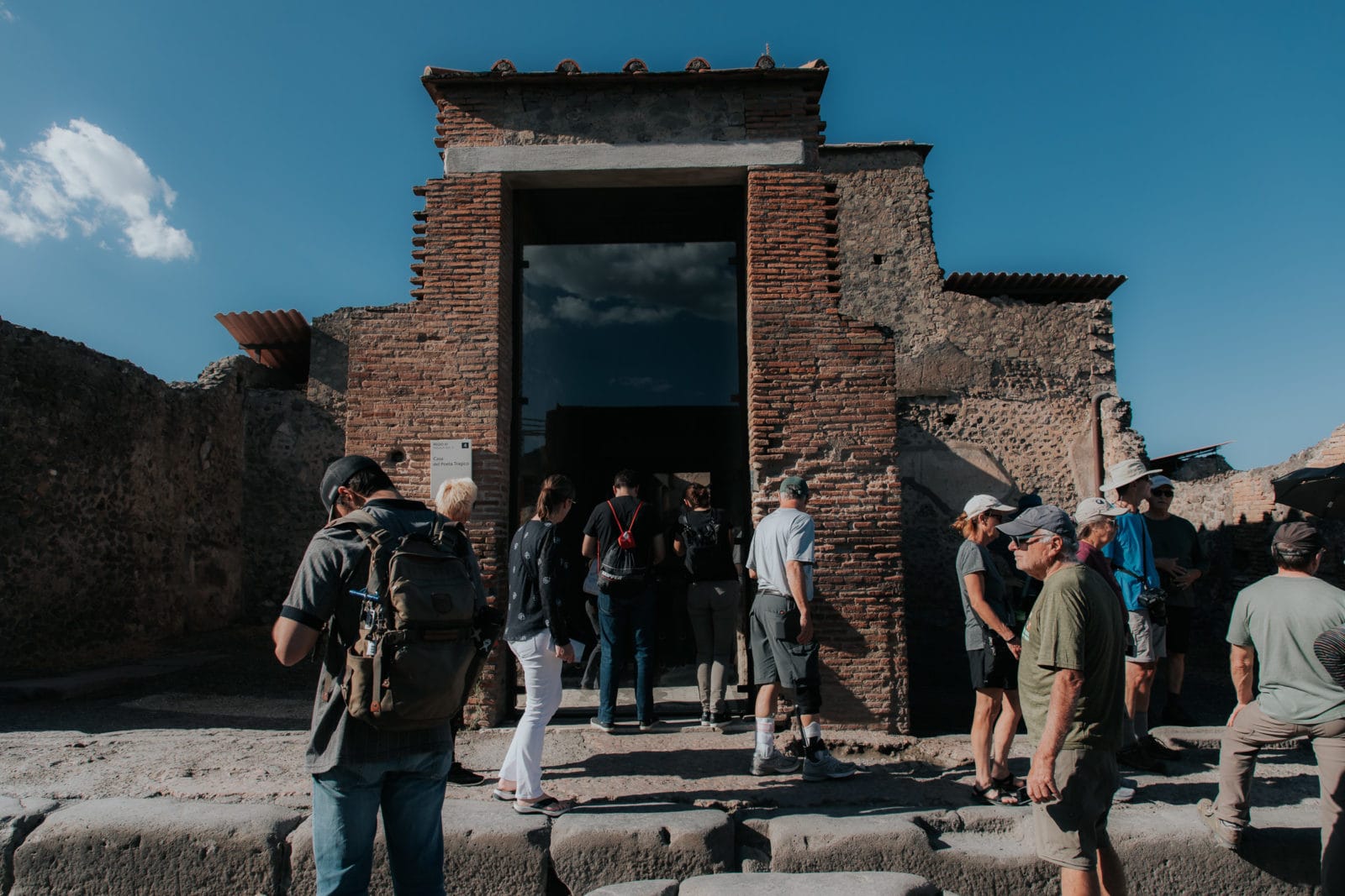 Wie man im Hochsommer Pompeji überhaupt besichtigen kann, ist mir ein Rätsel. Schon bei unserem Besuch im kühleren Oktober schien die Sonne in Pompeji besonders heiß. Die Lage auf dem Hügel, viele Freiflächen und die massiven Steine überall heizen die Ausgrabung schnell auf. Allerdings stelle ich mir bei schlechterem Wetter und Regen den antiken Straßenbelag aus dicken Pflastersteine auch ziemlich rutschig vor. Wir hatten mit unserem sonnigen Herbsttag also viel Glück und bestes Pompeji-Wetter. Im Sommer soll die Sonne erbarmungslos sein. Auch die Menge der Besucher ist selbst in der Nebensaison eine Herausforderung: Wir hatten Mühe, immer den richtigen Slot zwischen zwei Führungen bei den einzelnen Häusern zu finden.