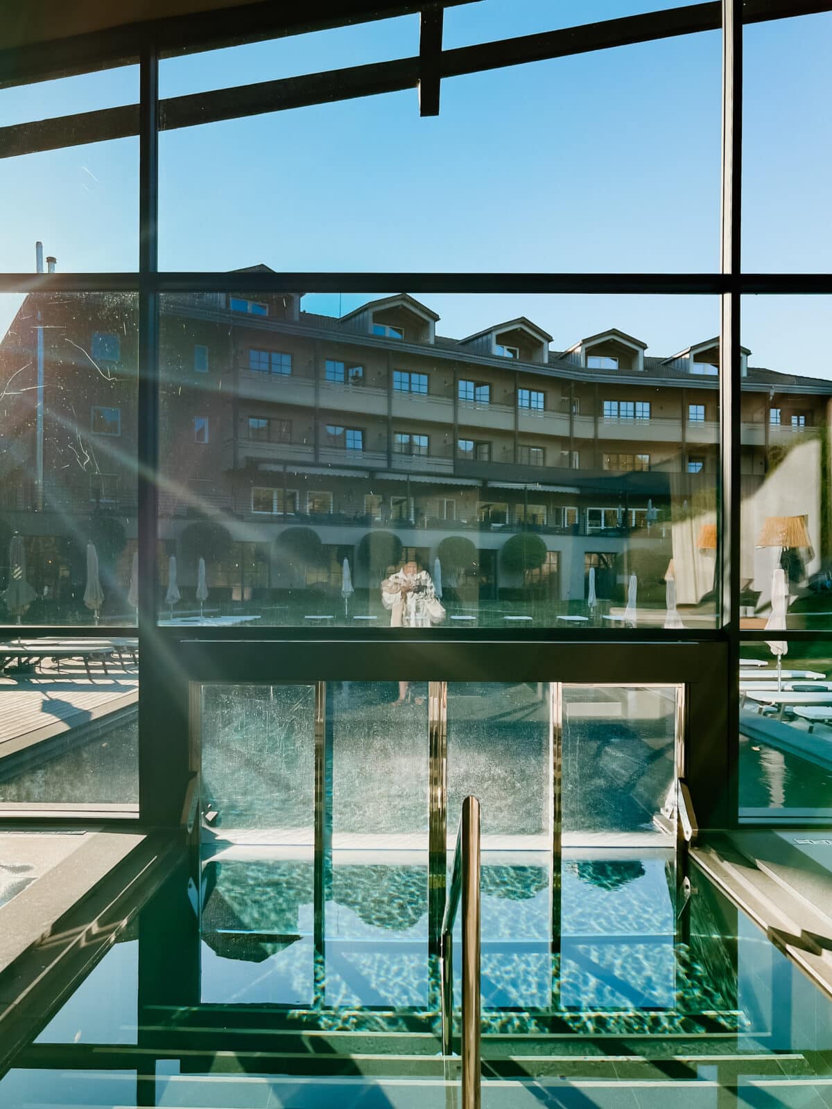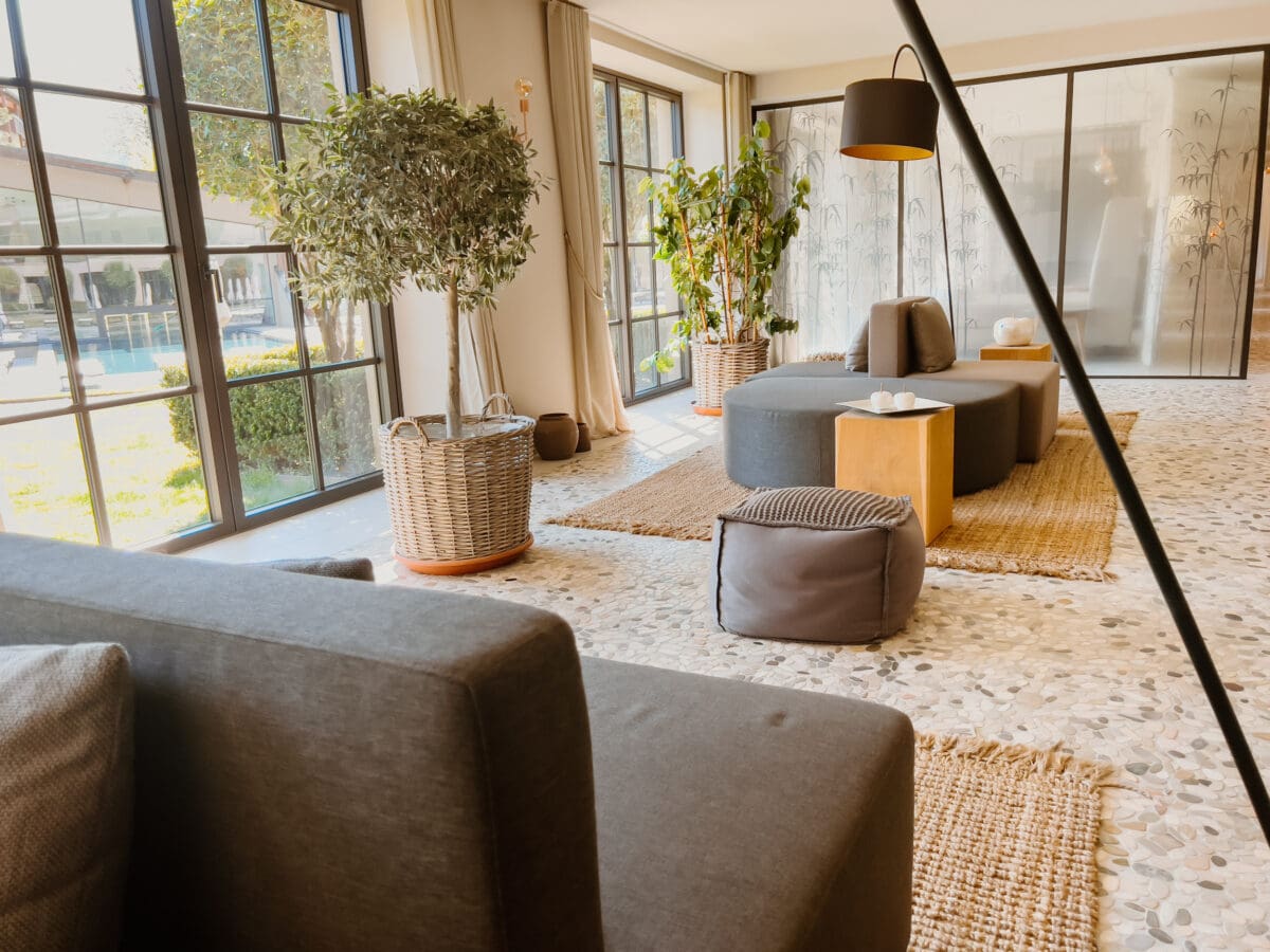 Der Wellnessbereich befindet sich im Anbau, der durch seine besondere Architektur aber nahezu mit der grünen Umgebung zu verschmelzen scheint. Und so fällt von außen gar nicht auf, wie viel Platz es im Seehof zum Entspannen gibt. Im Untergeschoss des Hotels befinden sich die Räumlichkeiten für Massagen und Behandlungen, von dort aus geht weiter in den Sauna- und Poolbereich.