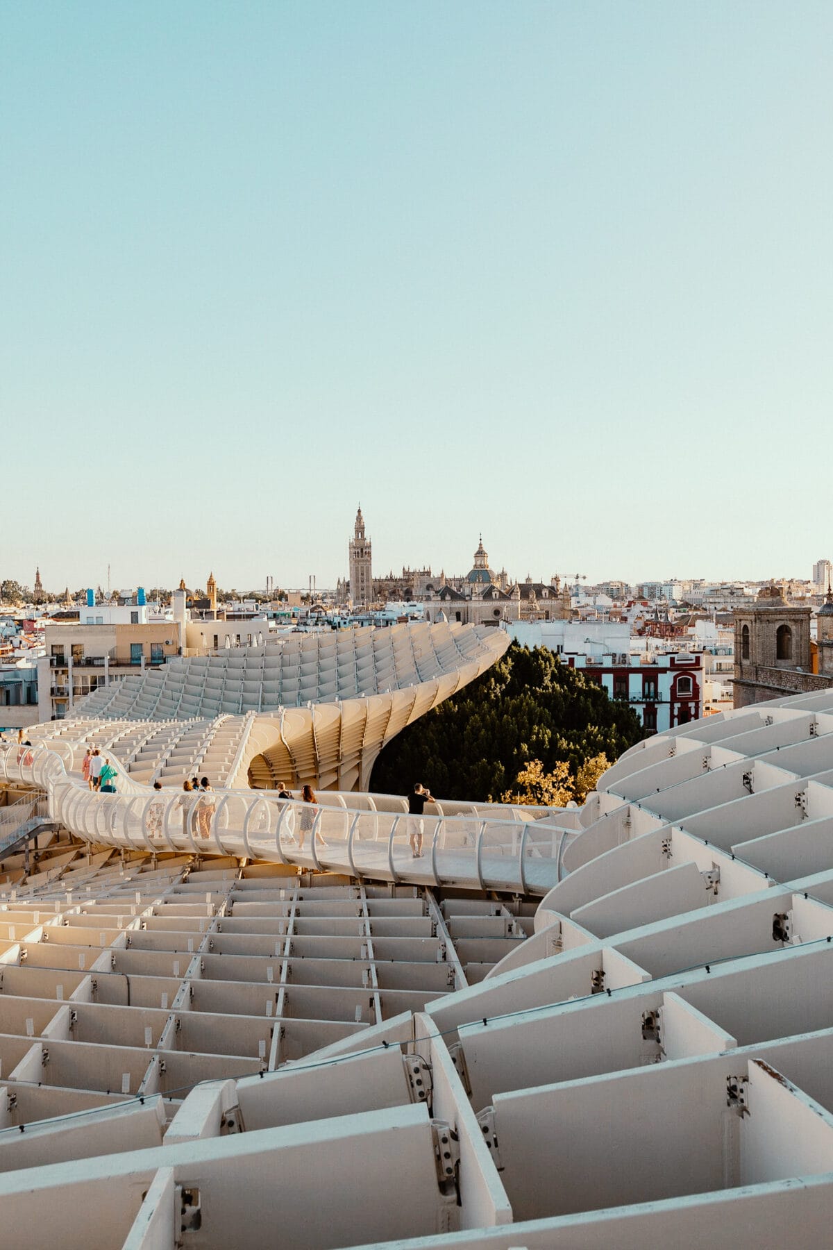 Von der Aussichtsplattform auf dem Metropol Parasol hast du die beste Aussicht über die Innenstadt von Sevilla. Ich empfehle dir auf jeden Fall einen Besuch zum Sonnenuntergang. Wenn sich die letzten Sonnenstrahlen über die Stadt legen, ist die Stimmung hier besonders toll! In der Umgebung des Metropol Parasol gibt es auch viele Restaurants und Bars, in denen du dann den Abend ausklingen lassen kannst.