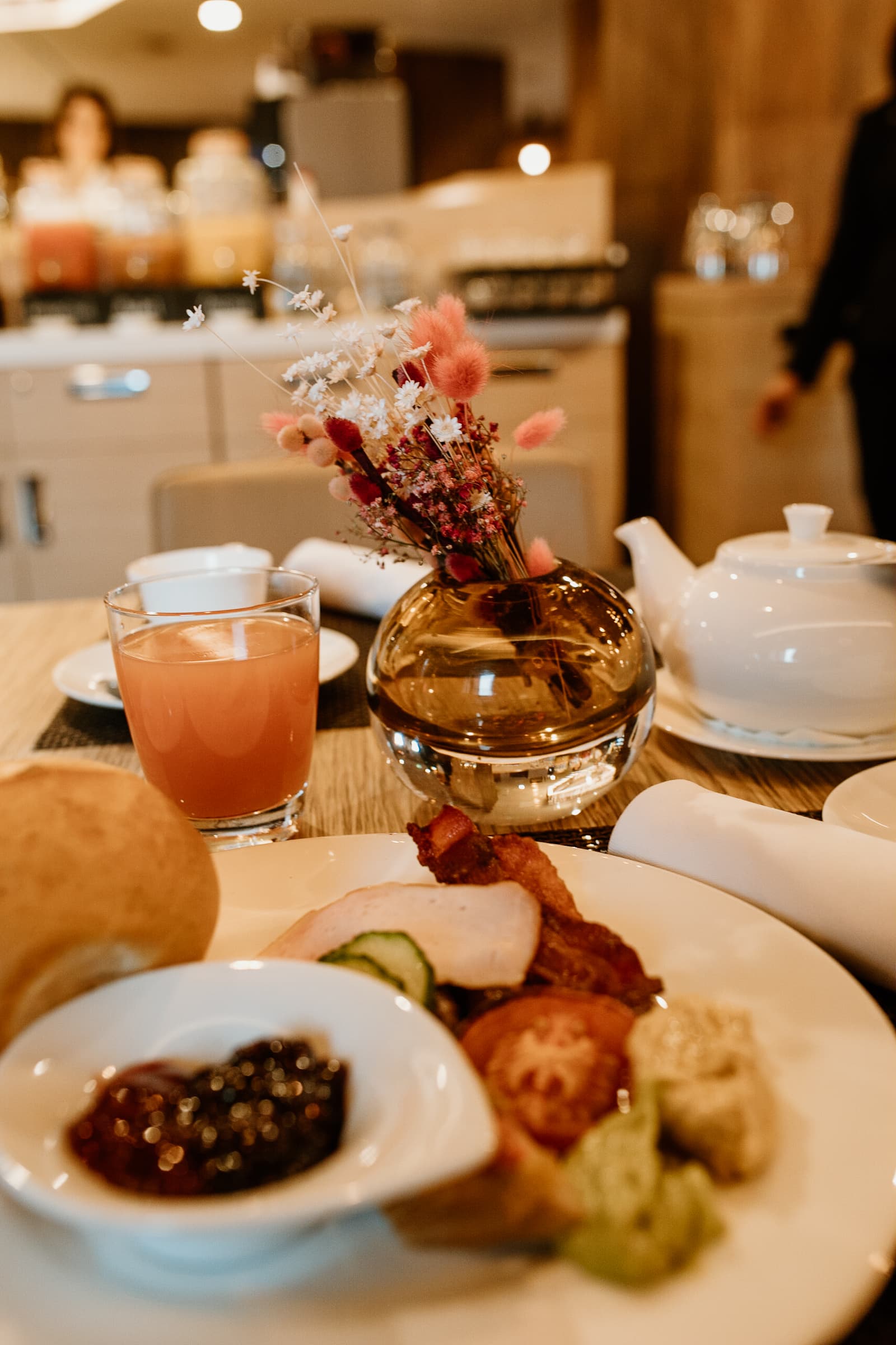 Das Frühstücksbüffet ist reichhaltig und wirklich gut, und es gibt sogar eine komplett separate Ecke mit veganen Optionen. Der Frühstücksbereich ist im unteren Teil des Gebäudes untergebracht, und ich denke, es ist der architektonischen Gegebenheit als ehemaliges Speichergebäude geschuldet, dass man hier leider keinen Rundumblick mit riesigen Fensterfronten findet. Es gibt aber eine kleine Außenterrasse mit Ausblick, also am besten zu den unbequemsten Frühstückszeiten kommen, damit du dort einen Platz ergattern kannst.