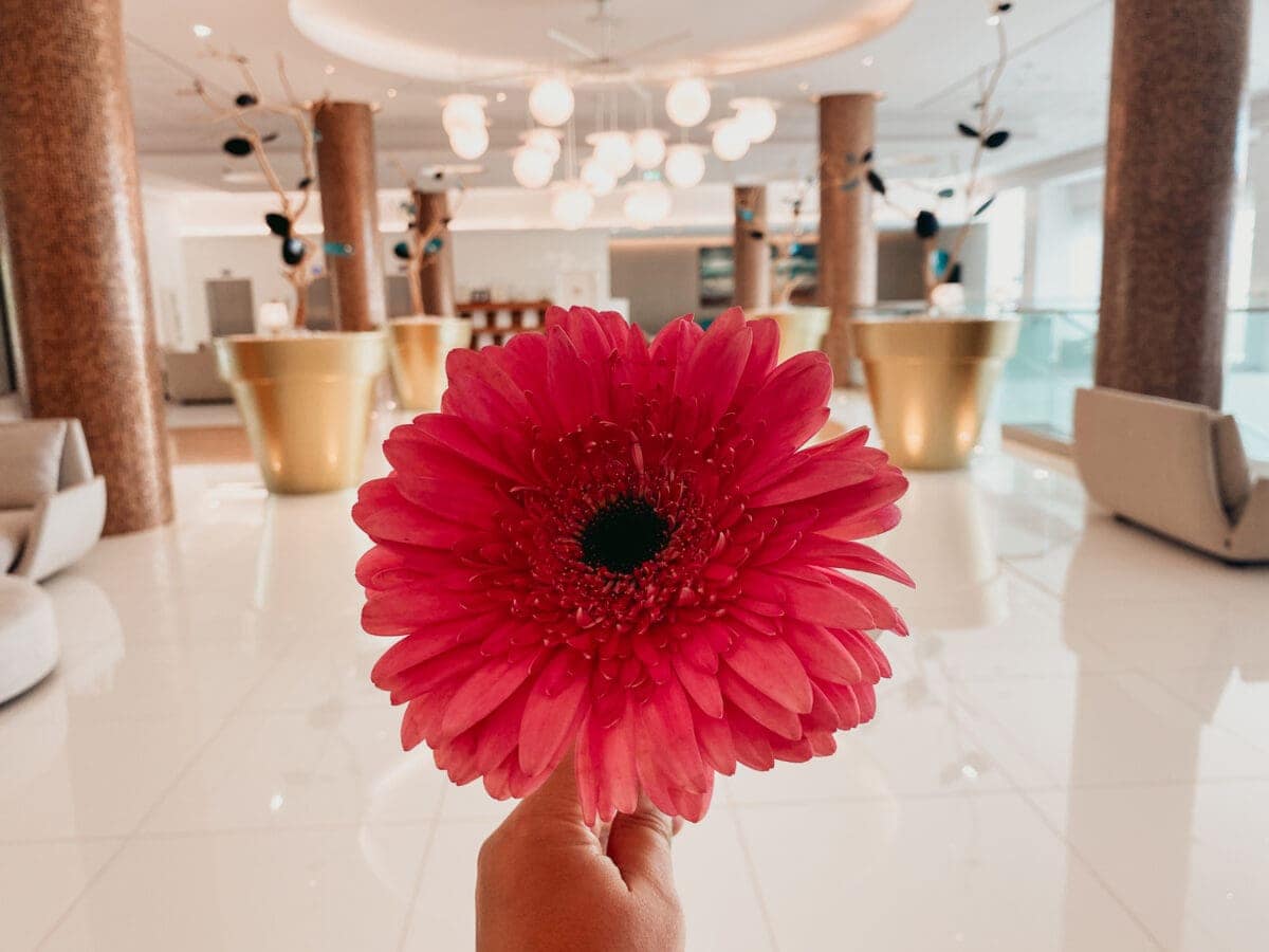 Die Lobby ist groß, einladend und sehr golden, eine Wand zieren allerlei gerahmte Zertifikate und Auszeichnungen mit vielen Sternchen und Noten. Es dauert keine zwei Minuten und schon bin ich begrüßt, eingecheckt, habe meinen Zimmerschlüssel zusammen mit einer Blume in die Hand gedrückt bekommen und sehe mein Gepäck irgendwo auf einem dieser schönen Hotelwagen Richtung Zimmer gleiten; der Mietwagen, den ich einfach vor der Tür stehengelassen habe, ist schon längst weggeparkt — und ich bin im Handumdrehen in einer anderen Welt gelandet.
